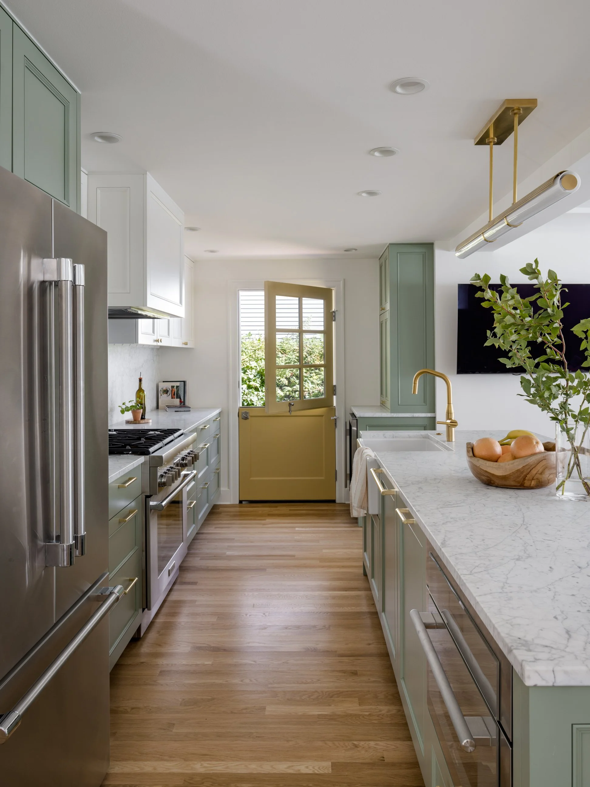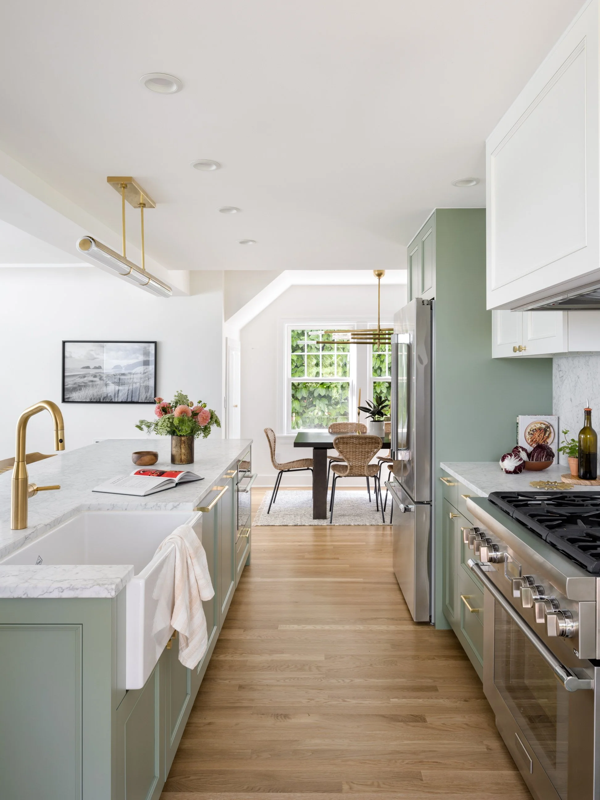 With a focus on culinary pursuits and entertainment, we orchestrated the creation of an expansive open kitchen-living room-dining room area. This involved dismantling a maze of outdated walls and cabinets, providing a clean slate for a more contemporary and airy ambiance. A refined palette featuring marble, oak flooring, and sage green cabinetry not only brightened the space but also brought a modern touch.
